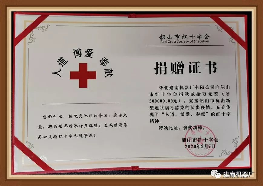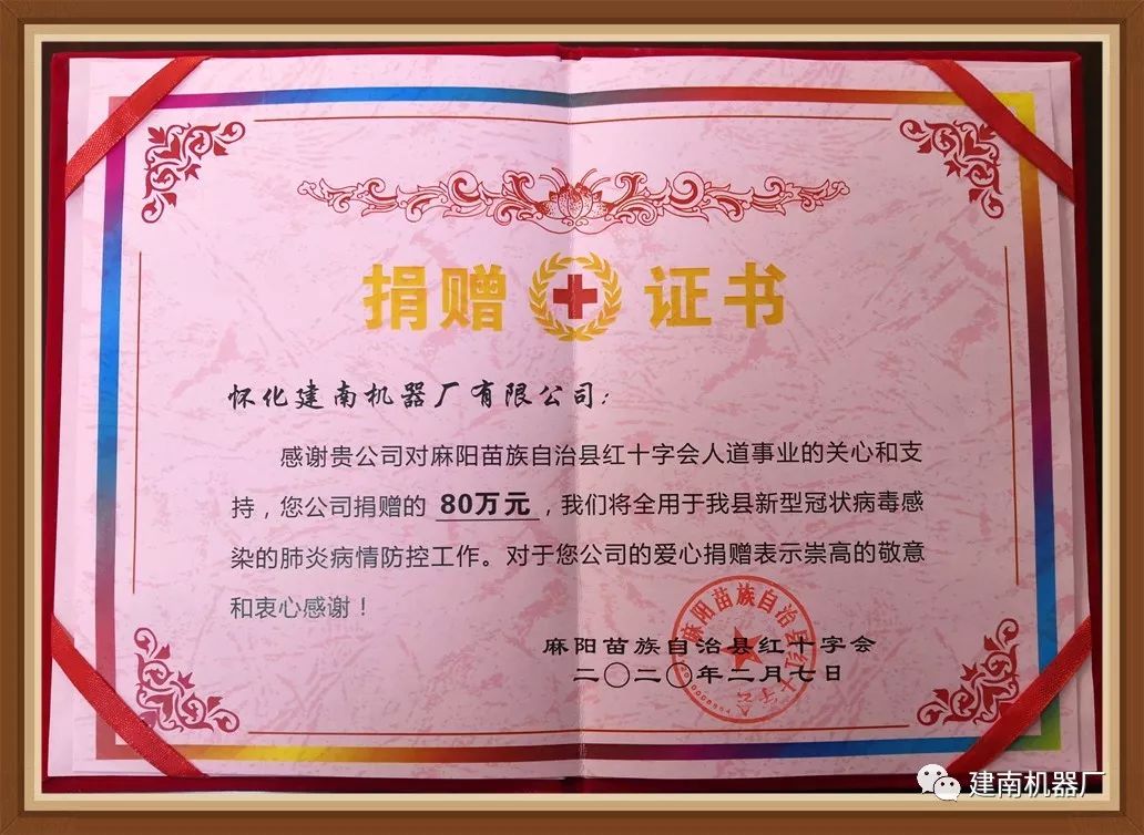 懷化建南機器廠有限公司在總經理李靖先生的帶領下,認真貫徹落實各級政府關于做好疫情防控工作的重要指示。公司在做好企業(yè)自身防控疫情工作的同時,積極響應政府各部門聯合發(fā)出的抗擊新型冠狀病毒肺炎疫情募捐活動倡議號召,勇于履行社會責任,于2020年2月7日,分別向麻陽縣紅十字會捐贈80萬元、向韶山市紅十字會捐贈20萬元,公司盡全力支持抗擊新型冠狀病毒肺炎疫情防控工作。
